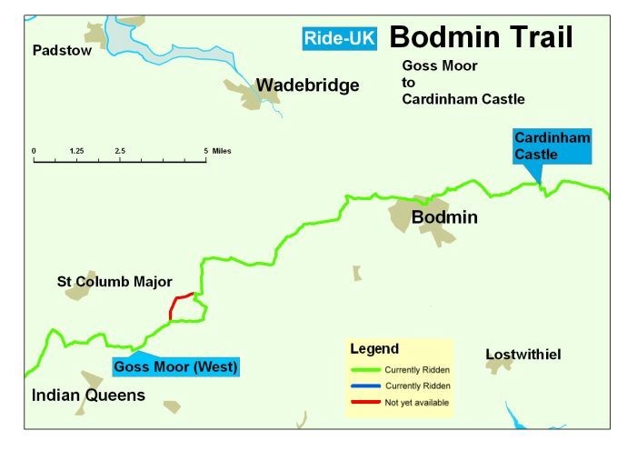 Bodmin Trail The Bodmin Trail Section starts on Goss Moor by the Owl Sanctury and connects to the Goss Moor Trail which uses part of old A30 (when by-pass completed). From the Eastern side of Goss Moor the trail runs on quiet lanes North East , passing to the South of the village of Withiel through Withielgoose and then joins a good stretch of bridleway to join a quiet lane leading past Nanstallon and onto the Camel Trail. The trail then goes West using the Camel Trail to skirt Bodmin . The trail then proceeds East to cross over the A30 Bodmin Bypass and uses unclassified road and bridleway through Cardinham Woods to reach Cardinham Castle. | |
