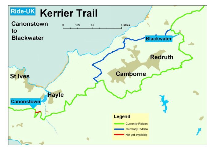 The Kerrier Trail The Kerrier Trail starts Canonstown (on the A30) West of St Erth. The trail goes on bridleways close to St Erth and then via St Erth Praze onto bridleways and byways to Gwinear. From Gwinear it loops south of Camborne and follows some lovely bridleways to Barripper and on through Pendarvis Woods and then on a quiet lanes to the village of Bolenowe via Troon. The Trail then takes bridleways to link with and follow the Great Flat Lode Trail and on north of Lanner up over Carn Marth where lovely views may be seen. The trail then skirts Caharrick using parts of the new Tramways Trail and then links with the Poldice Valley Trail through Unity Woods, to pass through Wheal Busy and then on to Blackwater. Alternatively a northern route can be taken which goes via Kehelland, the Red River, Tehidy Country Park Trail to Portreth and the Coast to Coast Trail. |
